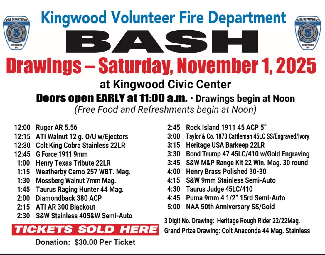 Fall Bash Tickets are available for purchase at Streets Store, Price Street Barbershop, the Kingwood Civic Center and Kingwood Pharmacy. You can also contact any Kingwood Volunteer Fire Department member. Tickets are $30.